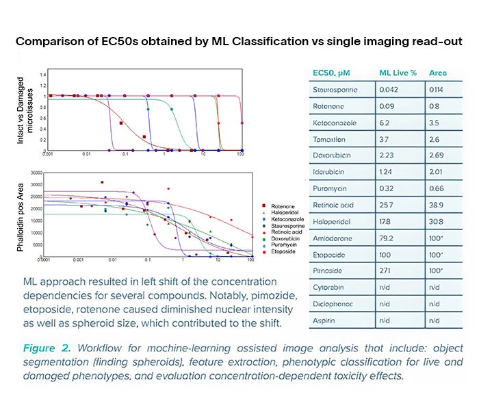 In an AI-assisted screening study, researchers used 3D liver microtissues (3D Insight™ Liver Model) to develop an imaging-based in vitro assay for toxicity evaluation. Using a cell painting assay, a multiplexed fluorescent imaging technique was applied to capture key phenotypic changes. ImageXpress HCS.ai High-Content Screening System from Molecular Devices generated thousands of images per compound treatment, which were analyzed using machine learning by IN Carta software to identify early compound effects.
