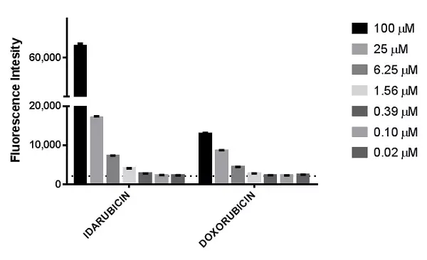 Labeled HL60 cells were treated with idarubicin or doxorubicin for 4 hours at multiple doses according to the protocol. At the end of the treatment cells were read end point in a fluorescent plate reader (Perking Elmer-Wallac 1420 Victor 2 Multilabel plate reader). Mean +/- standard deviation is plotted for 3 replicates from each condition. The dotted line represents the mean of 24 replicates of HL60 cells treated with 0.5% DMSO.