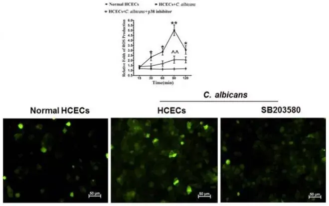 p38 MAPK pathway involved in oxidative injury to HCECs challenged with C. albicans. Increased ROS generation in HCECs challenged with C. albicans and inhibition by the p38 activation inhibitor SB203580.