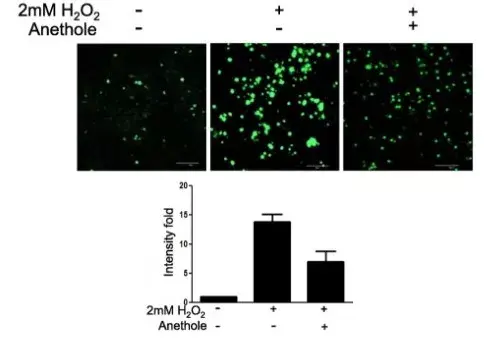 Effect of anethole on excessive ROS generation in hMSCs. hMSCs were exposed at 2 mM H2O2 for 30 min and incubated for 2 days in presence or absence of 50 μM anethole. ROS was measured by staining the cells with DCFDA cellular ROS detection assay kit according to the manufacturer's instructions. ROS generation was observed under a fluorescence microscope at 200× magnification.