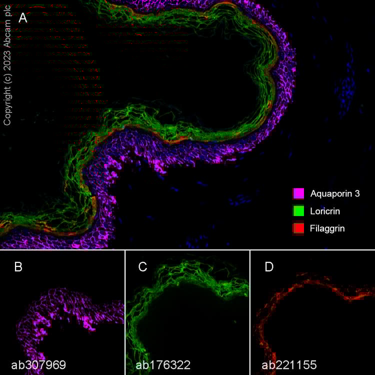 Rabbit Recombinant Monoclonal Filaggrin antibody. Suitable for mIHC, IHC-P and reacts with Human samples. Cited in 4 publications.