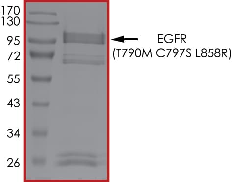 Recombinant human EGFR (mutated T790M + C797S + L858R) protein (Active) is a Human Fragment protein, in the 668 to 1210 aa range, expressed in Baculovirus infected Sf9, with >80% purity and suitable for SDS-PAGE, FuncS.
