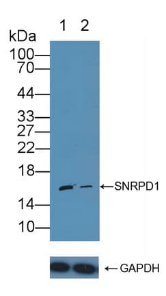 Rabbit Polyclonal SNRPD1 antibody. Suitable for WB, IHC-P and reacts with Rat, Pig, Recombinant fragment - Human, Human samples. Cited in 1 publication. Immunogen corresponding to Recombinant Full Length Protein corresponding to Human SNRPD1.