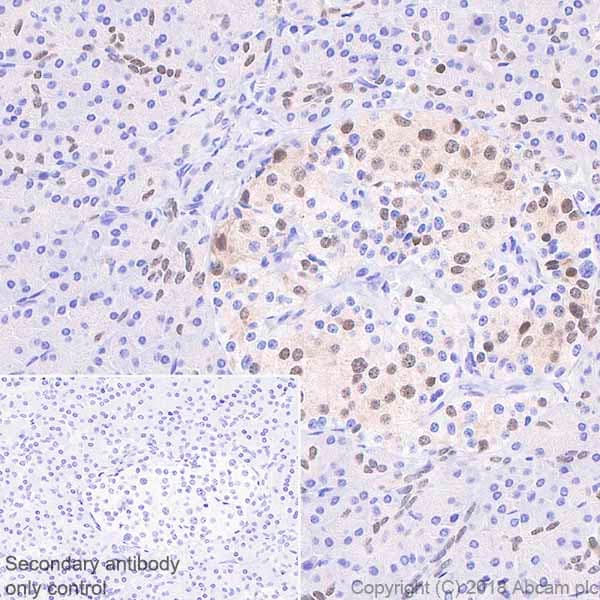 Rabbit Recombinant Monoclonal PDX1 antibody. Carrier free. Suitable for IHC-P, IP, WB, ICC/IF and reacts with Mouse, Rat, Human samples.