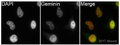Rabbit Monoclonal Geminin antibody. Carrier free. Suitable for WB, ICC/IF, IHC-P and reacts with Human samples. Cited in 1 publication.