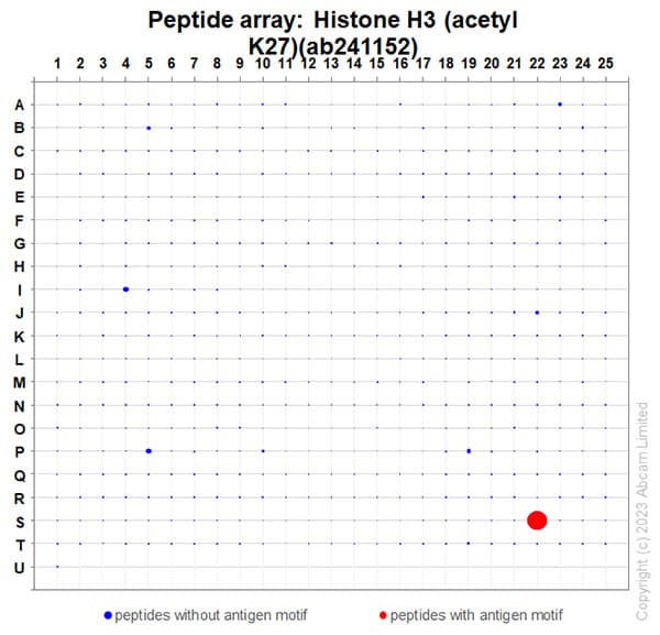 Rabbit Recombinant Monoclonal H3 acetyl K27 antibody. Suitable for WB, PepArr and reacts with Mouse, Human, Synthetic peptide samples.