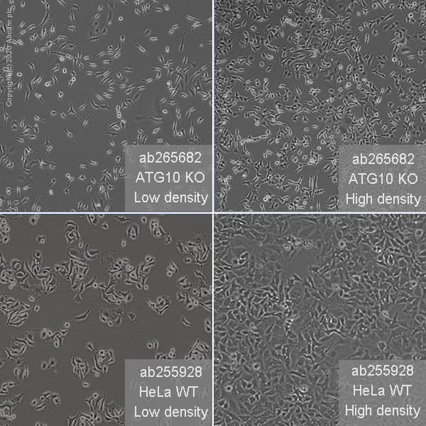 ATG10 KO cell line available to order. KO validated by Western blot. Free of charge wild type control provided. Knockout achieved by using CRISPR/Cas9, 5 bp deletion in exon 5 and 92 bp insertion in exon 5.