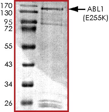 Recombinant human abL1 (mutated E255K) protein (Active) is a Human Fragment protein, in the 27 to 1130 aa range, expressed in Baculovirus infected Sf9, with >70% purity and suitable for SDS-PAGE, FuncS.