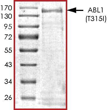 Recombinant human abL1 (mutated T315I) protein (Active) is a Human Fragment protein, in the 27 to 1130 aa range, expressed in Baculovirus infected Sf9, with >70% purity and suitable for SDS-PAGE, FuncS.