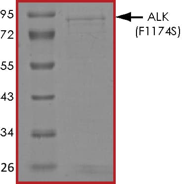 Recombinant human ALK (mutated F1174S) protein (Active) is a Human Fragment protein, in the 1060 to 1620 aa range, expressed in Baculovirus infected Sf9, with >70% purity and suitable for SDS-PAGE, FuncS.