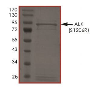 Recombinant human ALK (mutated S1206R) protein (Active) is a Human Fragment protein, in the 1060 to 1620 aa range, expressed in Baculovirus infected Sf9, with >75% purity and suitable for SDS-PAGE, FuncS.