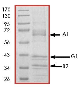 Recombinant human AMPK alpha 1 + AMPK gamma 1 + AMPK beta 2/PRKab2 protein (Active) is a Human Full Length protein, in the 1 to 272 aa range, expressed in Baculovirus infected Sf9, with >70% purity and suitable for SDS-PAGE, FuncS.