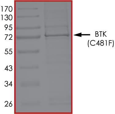 Recombinant human BTK (mutated C481F) protein (Active) is a Human Full Length protein, expressed in Baculovirus infected Sf9, with >70% purity and suitable for SDS-PAGE, FuncS.