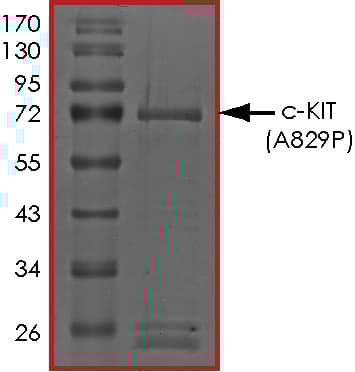 Recombinant human c-Kit (mutated A829P) protein (Active) is a Human Fragment protein, in the 544 to 976 aa range, expressed in Baculovirus infected Sf9, with >80% purity and suitable for SDS-PAGE, FuncS.