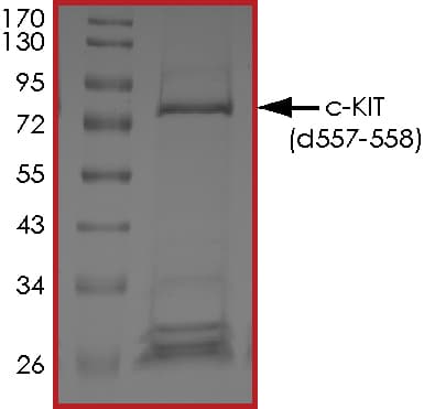 Recombinant human c-Kit deletion 557-558 protein (Active) is a Human Fragment protein, in the 544 to 976 aa range, expressed in Baculovirus infected Sf9, with >80% purity and suitable for SDS-PAGE, FuncS.