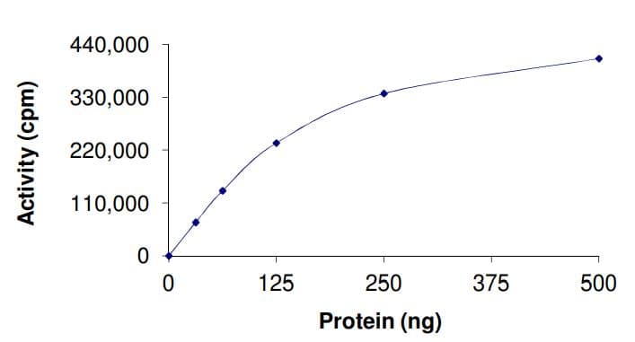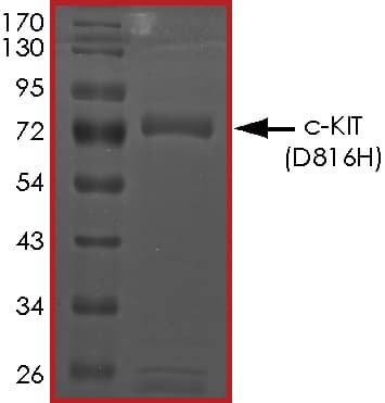 Recombinant human c-Kit (mutated D816H) protein (Active) is a Human Fragment protein, in the 544 to 976 aa range, expressed in Baculovirus infected Sf9, with >90% purity and suitable for SDS-PAGE, FuncS.