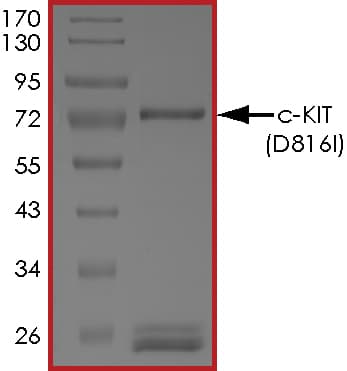 Recombinant human c-Kit (mutated D816I) protein (Active) is a Human Fragment protein, in the 544 to 976 aa range, expressed in Baculovirus infected Sf9, with >70% purity and suitable for SDS-PAGE, FuncS.