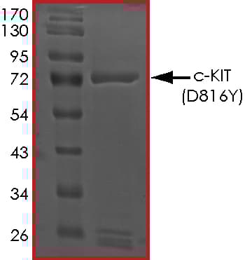 Recombinant human c-Kit (mutated D816Y) protein (Active) is a Human Fragment protein, in the 544 to 976 aa range, expressed in Baculovirus infected Sf9, with >90% purity and suitable for SDS-PAGE, FuncS.