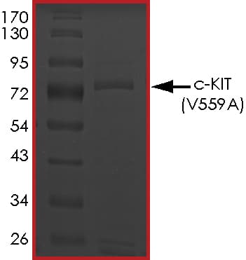 Recombinant human c-Kit (mutated V559A) protein (Active) is a Human Fragment protein, in the 544 to 976 aa range, expressed in Baculovirus infected Sf9, with >80% purity and suitable for SDS-PAGE, FuncS.