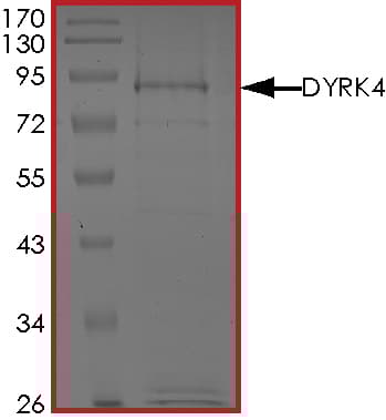 Recombinant human DYRK4 protein (Active) is a Human Full Length protein, in the 1 to 520 aa range, expressed in Baculovirus infected Sf9, with >75% purity and suitable for SDS-PAGE, FuncS.