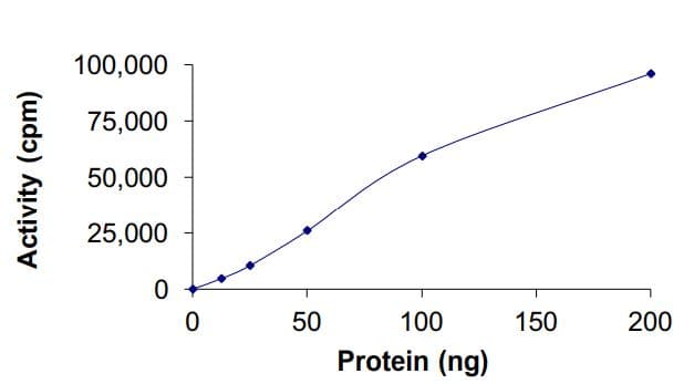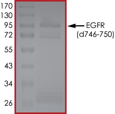 Recombinant EGFR protein deletion 746-750 (Active) is a Human Fragment protein, in the 669 to 1210 aa range, expressed in Baculovirus infected Sf9, with >70% purity and suitable for SDS-PAGE, FuncS.
