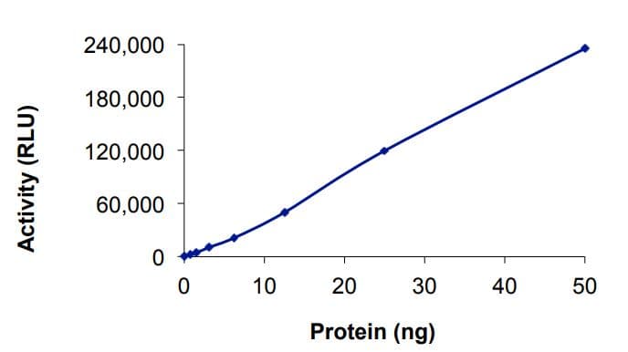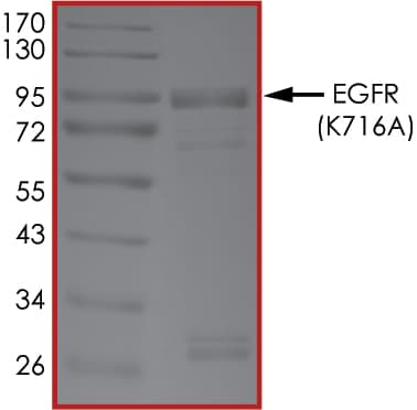 Recombinant human EGFR (mutated K716A) protein (Active) is a Human Fragment protein, in the 668 to 1210 aa range, expressed in Baculovirus infected Sf9, with >70% purity and suitable for SDS-PAGE, FuncS.