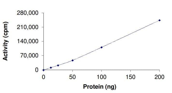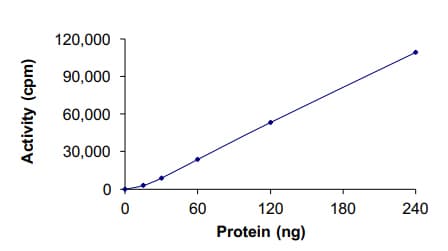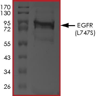 Recombinant human EGFR (mutated L747S) protein (Active) is a Human Fragment protein, in the 695 to 1210 aa range, expressed in Baculovirus infected Sf9, with >80% purity and suitable for SDS-PAGE, FuncS.