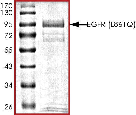 Recombinant human EGFR (mutated L861Q) protein (Active) is a Human Fragment protein, in the 695 to 1210 aa range, expressed in Baculovirus infected Sf9, with >80% purity and suitable for SDS-PAGE, FuncS.