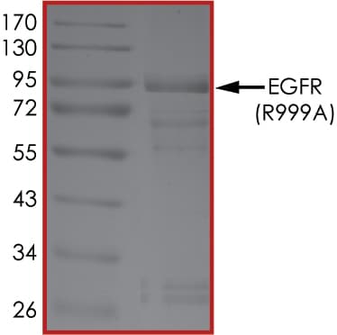 Recombinant human EGFR (mutated R999A) protein (Active) is a Human Fragment protein, in the 668 to 1210 aa range, expressed in Baculovirus infected Sf9, with >70% purity and suitable for SDS-PAGE, FuncS.