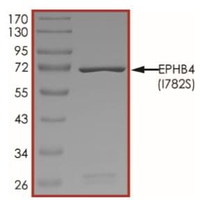 Recombinant Human Eph receptor B4/HTK (mutated I782S) protein (Tagged) is a Human Fragment protein, in the 561 to 987 aa range, expressed in Baculovirus infected Sf9, with >95% purity and suitable for SDS-PAGE.