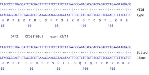 DPF2 KO cell line available to order. KO validated by Next Generation Sequencing, Western blot. Free of charge wild type control provided. Knockout achieved by CRISPR/Cas9 X = 1 bp deletion Frameshift = 99.77%.
