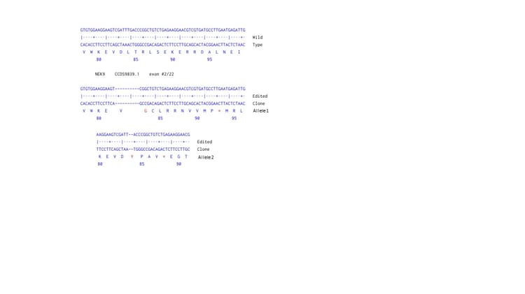 NEK9 KO cell line available to order. KO validated by Next Generation Sequencing, Western blot. Free of charge wild type control provided. Knockout achieved by CRISPR/Cas9; X = 10 bp deletion, 2 bp deletion; Frameshift: 99.78%.