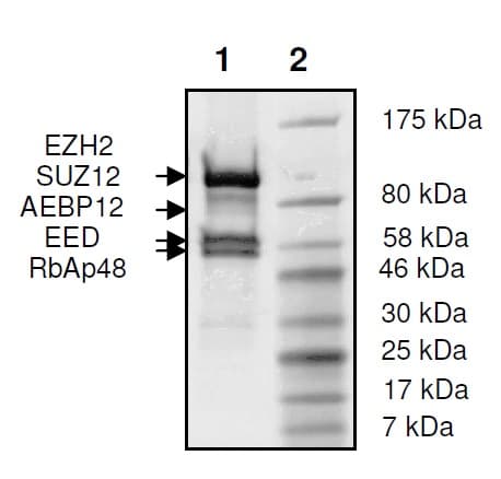 Recombinant Human RBBP4 + EED + SUZ12 + AEBP2 + EZH2 (mutated E740K) protein (Tagged) is a Human Full Length protein, in the 2 to 425 aa range, expressed in Baculovirus infected Sf9, with >=81% purity and suitable for SDS-PAGE.