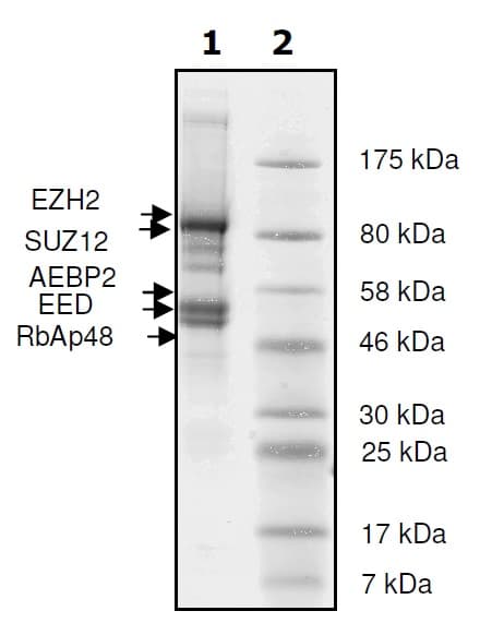 Recombinant Human RBBP4 + EED + SUZ12 + AEBP2 + EZH2 (mutated H689Y) protein (Tagged) is a Human Full Length protein, in the 2 to 746 aa range, expressed in Baculovirus infected Sf9, with >=87% purity and suitable for SDS-PAGE.