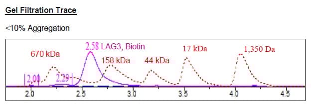 Recombinant Mouse LAG-3 protein (Tagged) (Biotin) is a Mouse Fragment protein, in the 23 to 442 aa range, expressed in HEK 293, with >=90% purity and suitable for SDS-PAGE, Size Exclusion Chromatography.