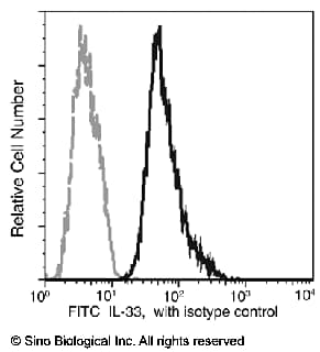 Mouse Monoclonal IL-33 antibody - conjugated to FITC. Suitable for Flow Cyt (Intra) and reacts with Human samples. Immunogen corresponding to Recombinant Fragment Protein within Human IL33 aa 100 to C-terminus.