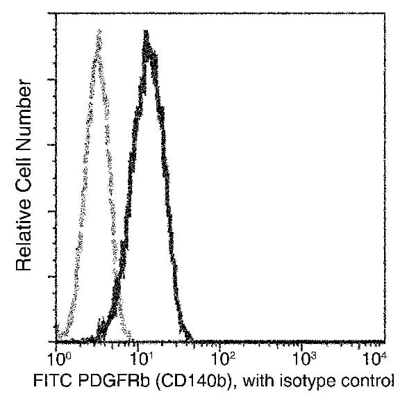 Mouse Monoclonal PDGFR beta antibody - conjugated to FITC. Suitable for Flow Cyt and reacts with Human samples. Immunogen corresponding to Recombinant Fragment Protein within Human PDGFRB aa 1-550.