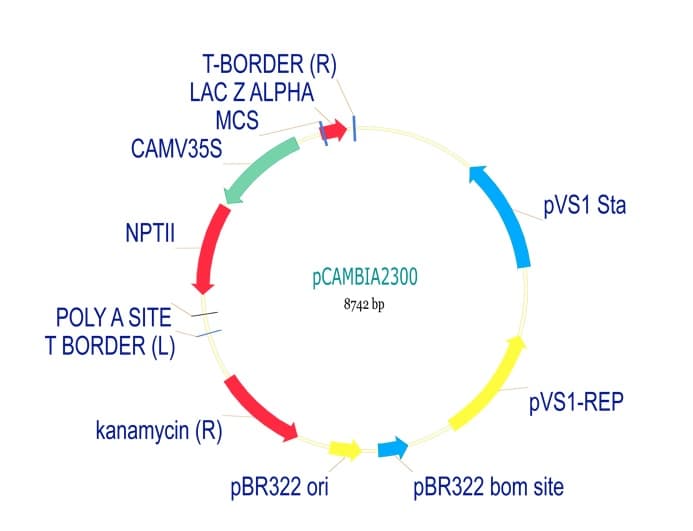 Vector contains genes for bacterial and plant selection with kanamycin and and no reporter gene to allow construction of user's own system.