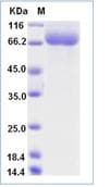Recombinant Human SIGLEC10 protein (His tag) is a Human Fragment protein, in the 17 to 550 aa range, expressed in HEK 293, with >95% purity, < 1 EU/µg endotoxin level and suitable for SDS-PAGE.
