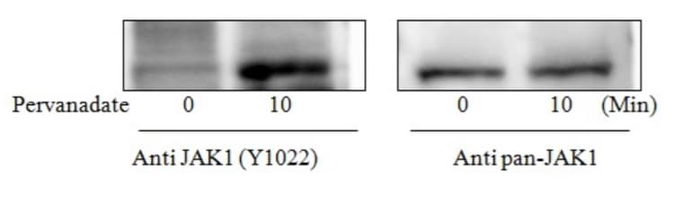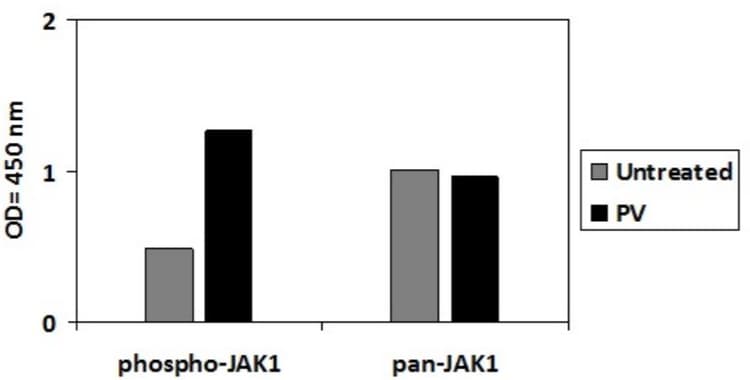 Phospho-JAK1 (Y1022) and Total JAK1 ELISA Kit is a Semi-quantitative ELISA kit for the measurement of Phospho-JAK1 (Y1022) and Total JAK1 in Human in Cell Lysate samples.
