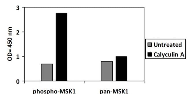 Phospho-MSK1 (S376) and Total MSK1 ELISA Kit is a Semi-quantitative ELISA kit for the measurement of Phospho-MSK1 (S376) and Total MSK1 in Human in Cell Lysate samples.