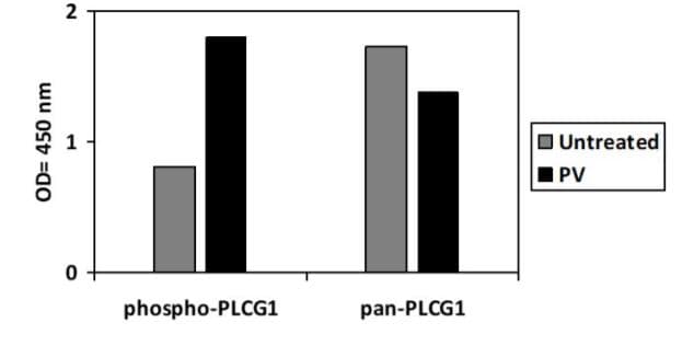 Phospho-PLCG1 (Y771) and Total PLCG1 ELISA Kit is a Semi-quantitative ELISA kit for the measurement of Phospho-PLCG1 (Y771) and Total PLCG1 in Human in Cell Lysate samples.