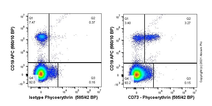 Rabbit Recombinant Monoclonal CD73 antibody - conjugated to PE. Suitable for Flow Cyt and reacts with Human samples. Cited in 2 publications.