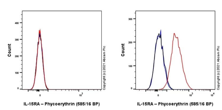 Rabbit Recombinant Monoclonal IL-15RA antibody - conjugated to PE. Suitable for Flow Cyt and reacts with Human samples.