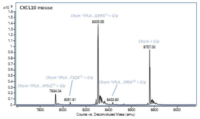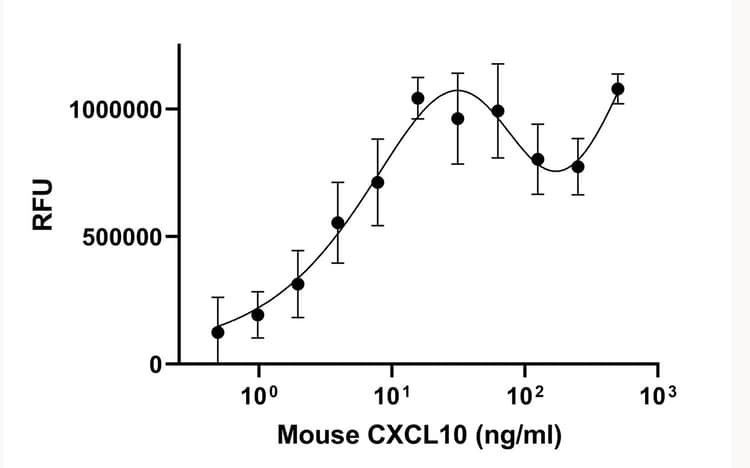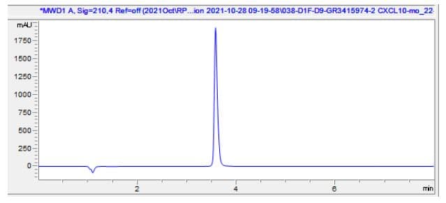 Recombinant Mouse CXCL10 Protein (Active) is a Mouse Fragment protein, in the 22 to 98 aa range, expressed in HEK 293, with >95% purity, <= 0.005 EU/µg endotoxin level and suitable for SDS-PAGE, MS, Biological Activity, HPLC.