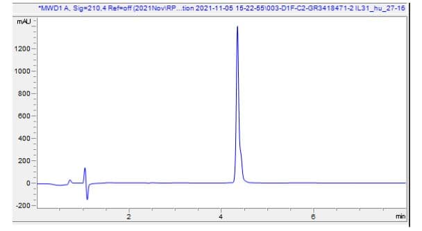Recombinant Human IL-31 protein (Active) is a Human Full Length protein, in the 27 to 164 aa range, expressed in HEK 293, with >=95% purity, < 0.005 EU/µg endotoxin level and suitable for SDS-PAGE, MS, HPLC, Cell Culture, FuncS.