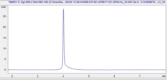 Recombinant Human UPAR Protein (Active) is a Human Fragment protein, in the 23 to 303 aa range, expressed in HEK 293, with >=95% purity and <= 0.005 EU/µg endotoxin level.