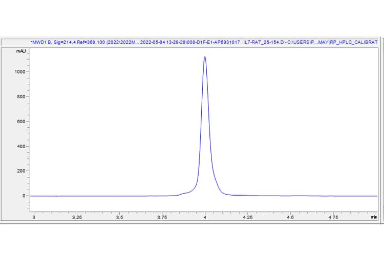 Recombinant Rat IL-7 Protein (Active) is a Rat Full Length protein, in the 26 to 154 aa range, expressed in HEK 293, with >=95% purity, <= 0.005 EU/µg endotoxin level and suitable for HPLC, MS, SDS-PAGE, FuncS.