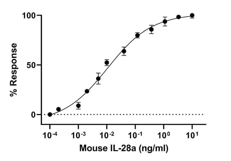 Recombinant Mouse IL-28A Protein (Active) is a Mouse Full Length protein, in the 20 to 193 aa range, expressed in HEK 293, with >=95% purity, <= 0.005 EU/µg endotoxin level and suitable for SDS-PAGE, HPLC, MS.