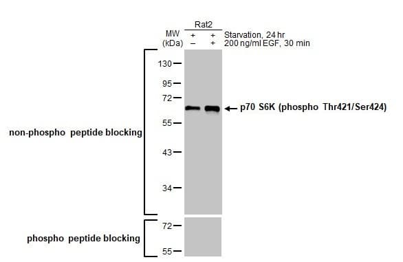 Rabbit Recombinant Monoclonal KS6B1 phospho T421 + S424 antibody. Carrier free. Suitable for IHC-P, WB and reacts with Mouse, Rat samples. Immunogen corresponding to Synthetic Peptide within Human S6K1 phospho T421 + S424.